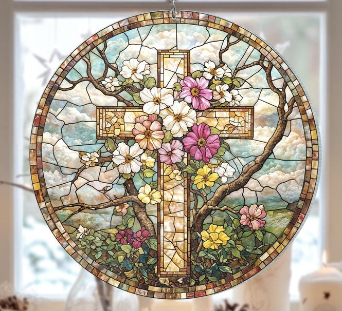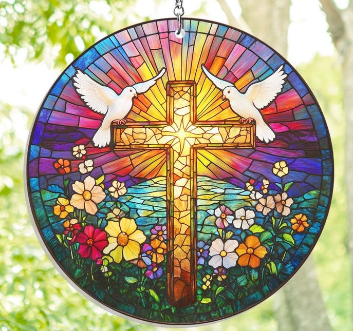 This stained glass cross sun catcher is a beautiful reminder of faith and love. The blend of delicate floral patterns and powerful symbolism adds a spiritual and emotional touch to any space, creating an atmosphere of peace, hope, and divine presence 🌸✨